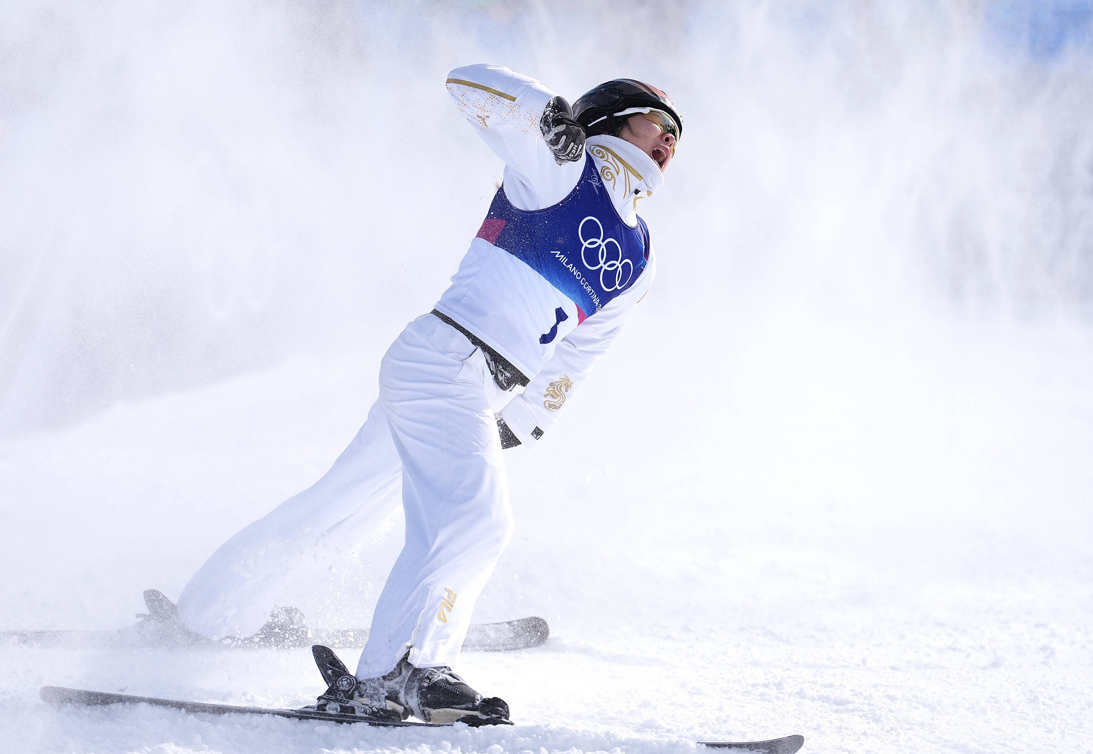 2月18日,徐梦桃在自由式滑雪女子空中技巧决赛比赛后庆祝。新华社记者 胡超 摄在当日举行的混合团体比赛中,由徐梦桃、王心迪、李天马组成的中国队在“大决赛”中出现失误,获得铜牌,没能弥补四年前在北京冬奥会上错失该项目金牌的遗憾。
